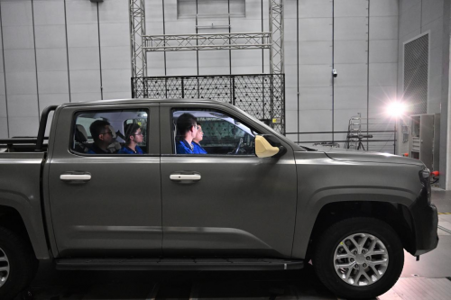 在測試過風(fēng)阻之后,我們再次見證了風(fēng)噪測試過程。在風(fēng)洞實驗室,測試人員采用聲學(xué)照相機車外噪聲識別、煙流試驗、開窗法風(fēng)噪試驗,再利用車內(nèi)的模擬人耳的傳感器和車門變形量測試監(jiān)測風(fēng)噪。測試結(jié)果顯示,江鈴大道風(fēng)噪表現(xiàn)優(yōu)于競品2分貝,在車內(nèi)交談的清晰度,也要優(yōu)于競品8%,位居行業(yè)領(lǐng)先水平。
