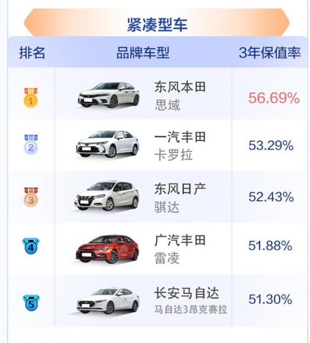 緊湊型車上榜車型均為日系車,且保值率差距小,同級(jí)競(jìng)爭(zhēng)依舊激烈。其中,東風(fēng)本田思域保值率56.69%位居榜首,其市場(chǎng)保有量大且相對(duì)價(jià)格體系穩(wěn)定,雖仍為細(xì)分市場(chǎng)保值率第一名,但相比2022年63.68%的數(shù)據(jù)下降明顯。