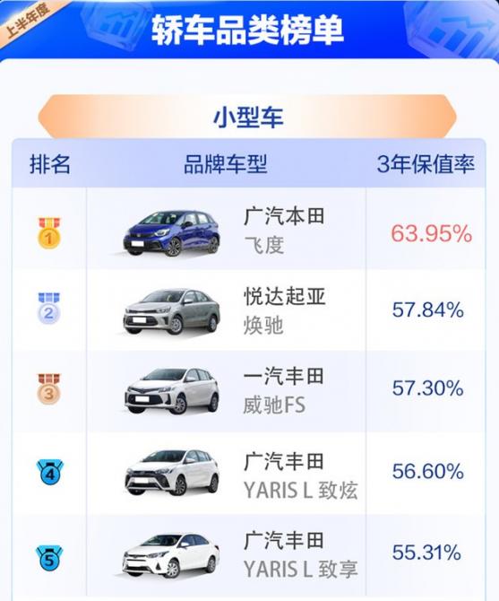具體來(lái)看,小型車榜單中,飛度再次鎖定同級(jí)別第一名位置,保值率超過63%。除了飛度外,煥馳以57.84%的保值率躍升第二,威馳家族基于性價(jià)比優(yōu)勢(shì),受關(guān)注度較高,且經(jīng)過市場(chǎng)檢驗(yàn),品質(zhì)出色、服務(wù)網(wǎng)點(diǎn)覆蓋率高,保值率為57.3%,相比去年整體排名下降一名。小型車市場(chǎng)雖然呈萎縮趨勢(shì),但頭部車型變化不大,且三年保值率相對(duì)其他車型市場(chǎng)表現(xiàn)出了很強(qiáng)的穩(wěn)定性。