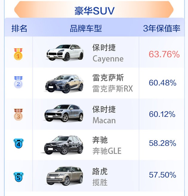 保時(shí)捷的豪華地位加較強(qiáng)的品牌溢價(jià)能力,拉高了旗下產(chǎn)品的保值率,Cayenne和Macan分別位于榜單的第一、三名;雷克薩斯RX回歸榜單,以60.48%的保值率拿到亞軍。豪華SUV市場(chǎng)的整體保值率水平較高,但近半年波動(dòng)也更大,受新車端優(yōu)惠政策影響,部分產(chǎn)品保值率下滑明顯。