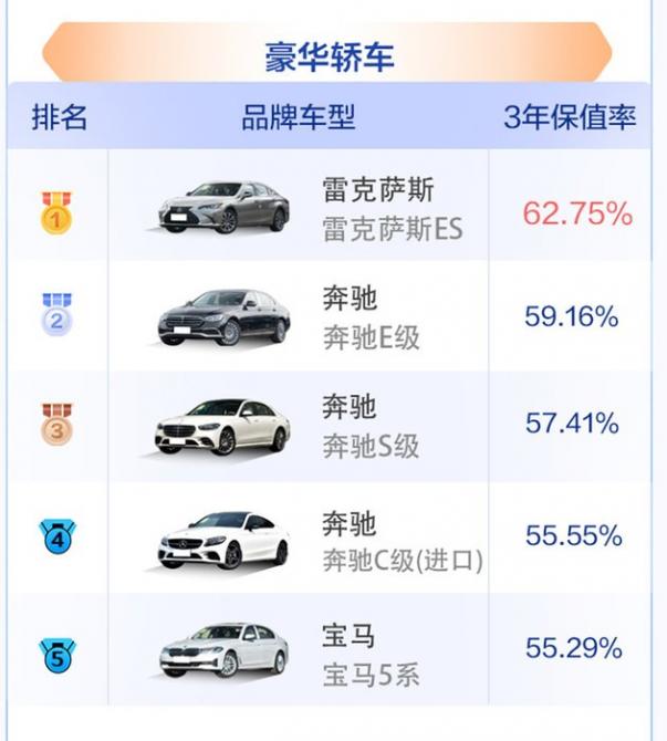 豪華轎車市場(chǎng)的整體排名變化不大,但整體保值率水平下降較多,主要是在新車市場(chǎng)上,其價(jià)格也出現(xiàn)了明顯松動(dòng);雷克薩斯ES保值率依舊領(lǐng)先,62.75%的保值率數(shù)據(jù)相比2022年68.08%下降明顯,這也與終端銷售價(jià)格松動(dòng)有一定關(guān)系。除此之外,上榜的奔馳3款車型和寶馬1款車型,三年保值率均已跌破60%。