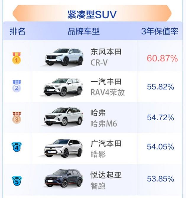 緊湊級(jí)SUV市場(chǎng)中出現(xiàn)了黑馬哈弗M6,在整體保值率下降趨勢(shì)下,其保值率相比2022年,上漲了超過10%,成為榜單第三。東風(fēng)本田CR-V以絕對(duì)優(yōu)勢(shì)鎮(zhèn)守第一名,也是榜上唯一拿到60%以上成績(jī)的車型,成績(jī)?yōu)?0.87%