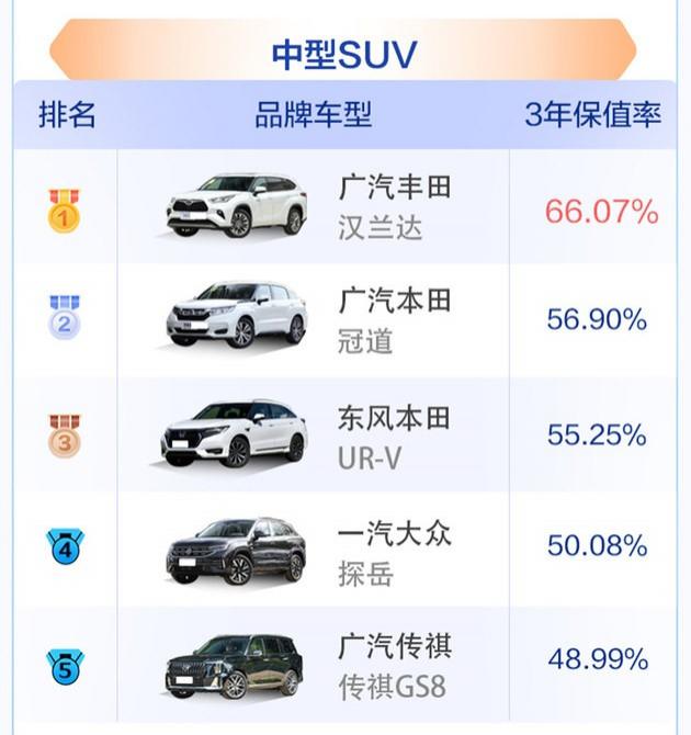 中型SUV市場(chǎng)保值率整體水平也出現(xiàn)了一定程度的下降,但漢蘭達(dá)保值率依舊非常穩(wěn)定,在該級(jí)別遙遙領(lǐng)先;受新車優(yōu)惠幅度增大的影響,冠道和UR-V雖然排名未變,但已經(jīng)與漢蘭達(dá)拉開差距。