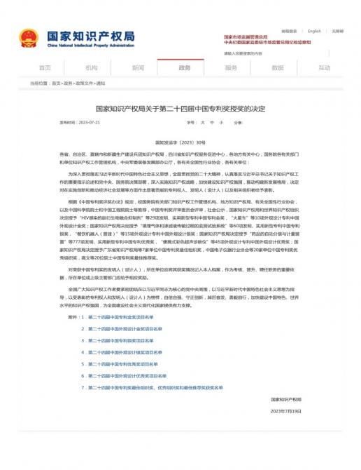 中國專利獎(jiǎng)是我國專利領(lǐng)域的最高獎(jiǎng)項(xiàng),由中國國家知識產(chǎn)權(quán)局和世界知識產(chǎn)權(quán)組織共同評選,是我國唯一對授予專利權(quán)的發(fā)明創(chuàng)造給予獎(jiǎng)勵(lì)的國家級獎(jiǎng)項(xiàng),代表著中國自主創(chuàng)新的最高水準(zhǔn),得到聯(lián)合國世界知識產(chǎn)權(quán)組織(WIPO)的支持與認(rèn)可,在國際上具有廣泛的影響力。