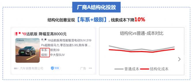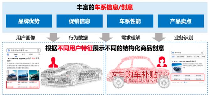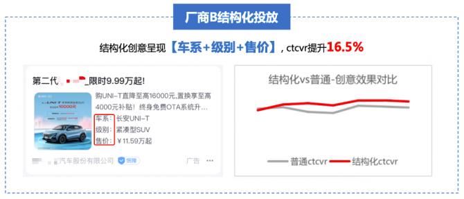 其二,結(jié)構(gòu)化創(chuàng)意;通過豐富多元的信息展示,能讓用戶看到價格、配置、外觀、優(yōu)惠禮包等全面的產(chǎn)品信息,更容易理解汽車賣點,從而吸引用戶點擊,提高轉(zhuǎn)化率。通俗來講,當消費者搜索后,在可視范圍內(nèi)盡可能完整的展示客戶產(chǎn)品所有相關(guān)信息。根據(jù)客戶歷史測試數(shù)據(jù),結(jié)構(gòu)化創(chuàng)意商品類組件相比同賬戶內(nèi)樣式曝光轉(zhuǎn)化率(ctcvr)提高了24%,客戶還可通過增加如油耗、動力、續(xù)航、價格等用戶購車時關(guān)注的產(chǎn)品信息,從而實現(xiàn)“產(chǎn)品找人”,進而提升廣告投放中的定向、創(chuàng)意和轉(zhuǎn)化效果。