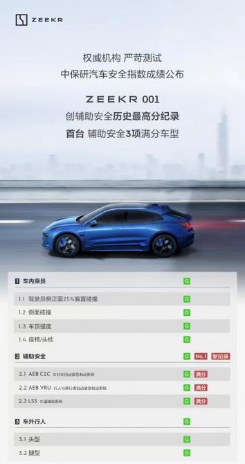在我國,中保研這個機構的可信度和權威性都得到了行業(yè)的廣泛認可。因此,能夠在中保研的測試中獲得優(yōu)異成績的車型,自然也會成為各自細分領域中的熱門選擇。在4月24日公布的結(jié)果中,極氪001以卓越的表現(xiàn)超越了大眾凌渡L、福特蒙迪歐、理想L8、瑪斯丹Mach-E等車型,在車輛輔助安全評價中獲得了G評級(優(yōu)秀),創(chuàng)造了中保研歷史最高分紀錄。同時,極氪001在車內(nèi)乘員安全評價獲得G(優(yōu)秀)、車外行人安全評價獲得G(優(yōu)秀)、耐撞性與維修經(jīng)濟性指數(shù)獲得A(良好)評價,綜合實力再次得到了肯定。