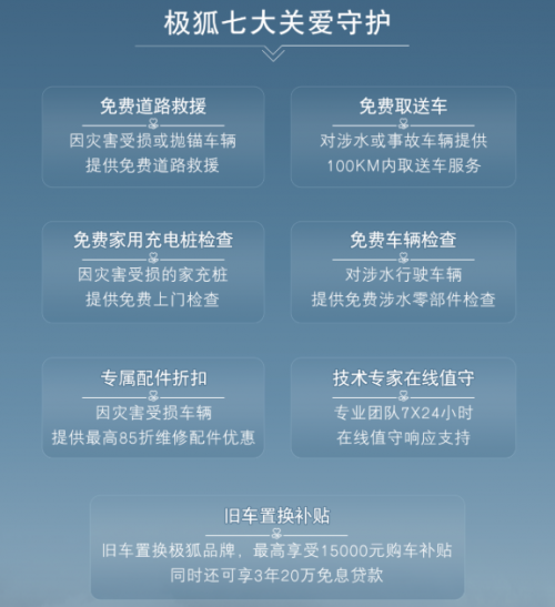 此前,極狐汽車發(fā)布了“七大關(guān)愛守護(hù)”,活動(dòng)時(shí)間從8月1日起持續(xù)至8月31日。包括費(fèi)道路救援、免費(fèi)取送車、免費(fèi)家用充電樁檢查、免費(fèi)車輛檢查、專屬配件折扣、技術(shù)專家在線值守、舊車置換補(bǔ)貼。這些舉措為車主提供全方位的幫助和支持,讓他們度過災(zāi)后重建的難關(guān)。