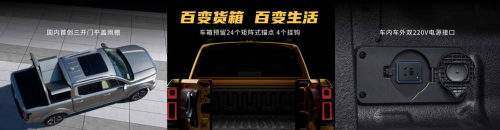 國(guó)內(nèi)首創(chuàng)三開門平蓋雨棚,電動(dòng)控制,可拆卸隔斷,增加空間百變性,玩轉(zhuǎn)全場(chǎng)景皮卡生活。