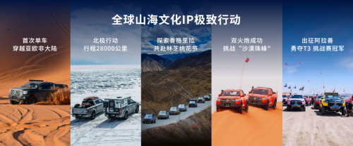 長城炮全球山海文化IP極致行動全面展開,攜手山海文化共創(chuàng)官,與用戶共赴山海、共享山海。山海炮首次單車穿越亞歐非大陸;北極行動,行程2萬8千公里,成功抵達北極圈;探索香格里拉、共赴林芝桃花節(jié);雙火炮 1分35秒成功挑戰(zhàn)“沙漠珠峰”;出征阿拉善,勇奪長城炮T3挑戰(zhàn)賽冠軍。