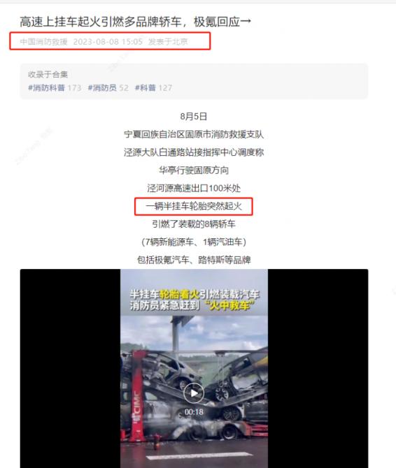 2023年8月5日,位于寧夏回族自治區(qū)固原市涇河源高速公路出口的一輛半掛車在行駛過程中突然起火,令人吃驚的是,火勢(shì)竟然蔓延到車上搭載的8輛轎車,其中包括7輛新能源車和1輛汽油車,涵蓋了極氪汽車和路特斯等品牌。由于其中有6輛是極氪品牌,該事故引發(fā)了網(wǎng)友對(duì)是否是極氪引發(fā)火災(zāi)的質(zhì)疑。然而,真相很快浮出水面。