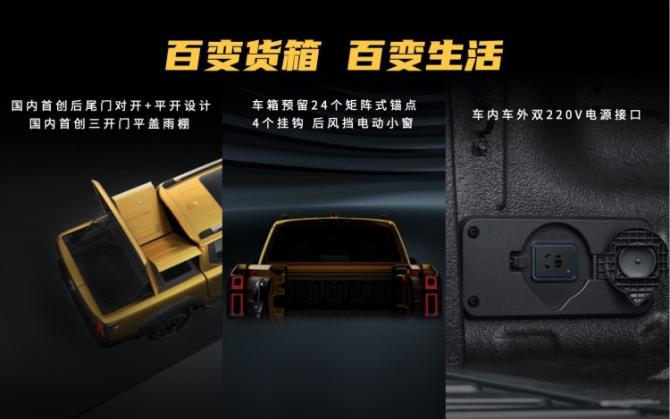 此外,山海炮性能版擁有開(kāi)放式百變后車箱,國(guó)內(nèi)首創(chuàng)平開(kāi)+對(duì)開(kāi)式后尾門,方便取放物資;國(guó)內(nèi)首創(chuàng)三開(kāi)門平蓋雨棚,電動(dòng)控制,可拆卸隔斷,增加空間百變性;出廠自帶C6拖掛牽引資質(zhì),滿足3.3噸拖車認(rèn)證,玩轉(zhuǎn)全場(chǎng)景皮卡車生活。