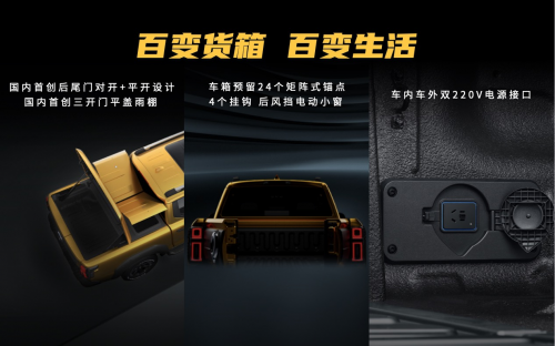 山海炮性能版還擁有開放式百變后車箱,國內(nèi)首創(chuàng)平開+對開式后尾門、三開門平蓋雨棚,出廠自帶C6拖掛牽引資質(zhì),滿足3.3噸拖車認(rèn)證,玩轉(zhuǎn)全場景皮卡車生活。