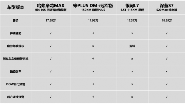 值得一提的是,很多消費(fèi)者購(gòu)買新能源車,也是看中了對(duì)外放電功能,能實(shí)現(xiàn)更精致、更便捷的露營(yíng)體驗(yàn)。其中,哈弗梟龍MAX全系標(biāo)配的外放電功能,功率可達(dá)3.3kW,輕松驅(qū)動(dòng)電磁爐、電烤箱、咖啡機(jī)等電器設(shè)備,將整車變成超級(jí)充電寶,給生活增添許多樂趣。但遺憾的是深藍(lán)S7和銀河L7作為新能源車型,居然沒有贈(zèng)送外放電插排。綜合看來,哈弗梟龍MAX配置更加豐富,更值得選購(gòu)。