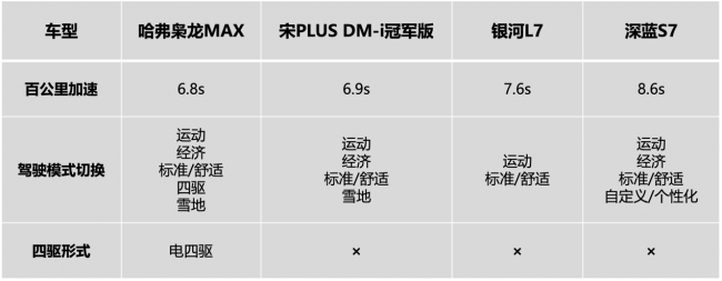 此外,哈弗梟龍MAX零百加速時(shí)間為6.8秒,媲美3.0T級(jí)別的燃油車,動(dòng)力表現(xiàn)上也更勝一籌!相比之下,銀河L7的百米加速?zèng)]有優(yōu)勢(shì),操控體驗(yàn)感不佳;而相比深藍(lán)S7的增程式混合動(dòng)力,在燃油經(jīng)濟(jì)性會(huì)略遜一籌;而宋 PLUS DM-i整體動(dòng)力調(diào)校偏家用,再加上其底盤支撐性不足,整體的在動(dòng)力和駕控體驗(yàn)上表現(xiàn)差強(qiáng)人意。