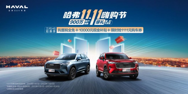 國民神車福利專場,感恩400萬車主熱愛,第三代哈弗H6限時推出多重購車好禮。11月1日-12日,在哈弗智家、天貓長城旗艦店、哈弗SUV的抖音和快手旗艦店,可限時領(lǐng)取1111元電商購車補貼。此外,11月1日-30日,無論是線上線下購車,均可享受購置稅全免+10000元購車現(xiàn)金補貼,以十足誠意助力消費者優(yōu)惠購車。