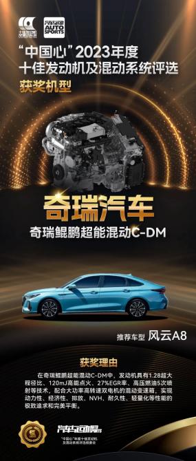 11月6日,由《汽車與運動》雜志社主辦的“中國心”2023年度十佳發(fā)動機及混動系統(tǒng)評選結(jié)果正式揭曉,奇瑞風(fēng)云A8所搭載的鯤鵬超能混動C-DM經(jīng)過嚴(yán)苛測試,最終斬獲“中國心”2023年度十佳發(fā)動機及混動系統(tǒng)大獎。此前,奇瑞已先后9次榮獲“中國心”十佳發(fā)動機稱號。此次再獲殊榮,彰顯了中國品牌在自研技術(shù)上的硬核實力。