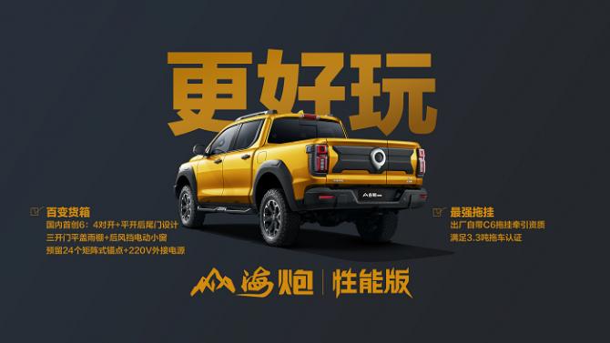 在滿足硬核越野需求基礎(chǔ)上,山海炮性能版也以豐富多變的功能設(shè)計(jì),滿足用戶戶外百變生活需求。國內(nèi)首創(chuàng)后尾門對開+平開設(shè)計(jì),方便取放物資,也可以當(dāng)作餐臺、茶臺,享受愜意的戶外生活。車箱預(yù)留24個矩陣式錨點(diǎn)、4個掛鉤,給用戶多種拓展可能,打造真正的超好玩萬能改裝車。車內(nèi)車外雙220V電源接口,滿足各類小型電器使用,無限拓展戶外新玩法。百變貨箱、萬能改裝,山海炮性能版助力用戶玩轉(zhuǎn)全場景皮卡車生活。