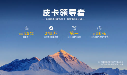 皮卡傳奇,始于長(zhǎng)城!作為皮卡領(lǐng)導(dǎo)者,長(zhǎng)城皮卡已連續(xù)25年銷量第一,全球累計(jì)銷量突破245萬(wàn),今年1-10月國(guó)內(nèi)終端市占率近50%,中國(guó)每賣出兩臺(tái)皮卡,就有一臺(tái)是長(zhǎng)城。長(zhǎng)城炮品牌誕生四周年,更成為首個(gè)突破50萬(wàn)臺(tái)的中國(guó)高端皮卡品牌,創(chuàng)造了新的“長(zhǎng)城炮速度”,持續(xù)引領(lǐng)中國(guó)皮卡向上。