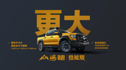 山海炮性能版擁有同級(jí)最大車身,以“大哥”姿態(tài)帶來(lái)同級(jí)最大、最寬、最舒適的駕乘空間。新車長(zhǎng)寬高分別為5462mm*1992mm*1960mm,軸距3350mm,輪距1635mm,接近全尺寸皮卡級(jí)別。車內(nèi)肘部寬度達(dá)1.6m,即使“大塊頭”也能伸展自如。