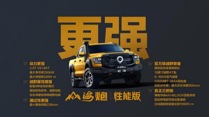 作為長城炮品牌2.0時代品類創(chuàng)新力作,山海炮性能版將硬派越野與智能豪華完美融合,更大、更強(qiáng)、更豪華、更好玩,是真正的戶外之王,以無與倫比的穿越能力、出眾的拖掛能力、百變的改裝能力、全場景休閑適應(yīng)能力,滿足用戶對戶外生活、山海萬物的向往。