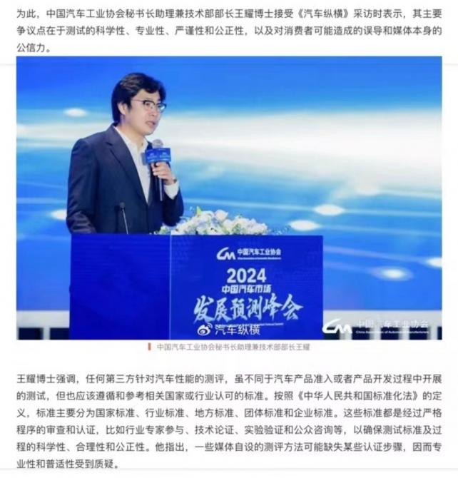 同時中國汽車工業(yè)協(xié)會秘書長助理兼技術(shù)部部長王耀博士表示,任何第三方針對汽車性能的測評應(yīng)該遵循和參考相關(guān)國家或行業(yè)認(rèn)可的標(biāo)準(zhǔn),以確保測試標(biāo)準(zhǔn)及過程的科學(xué)性、合理性和公正性。他指出,一些媒體自設(shè)的測評方法可能缺失某些認(rèn)證步驟,因而專業(yè)性和普適性受到質(zhì)疑。
