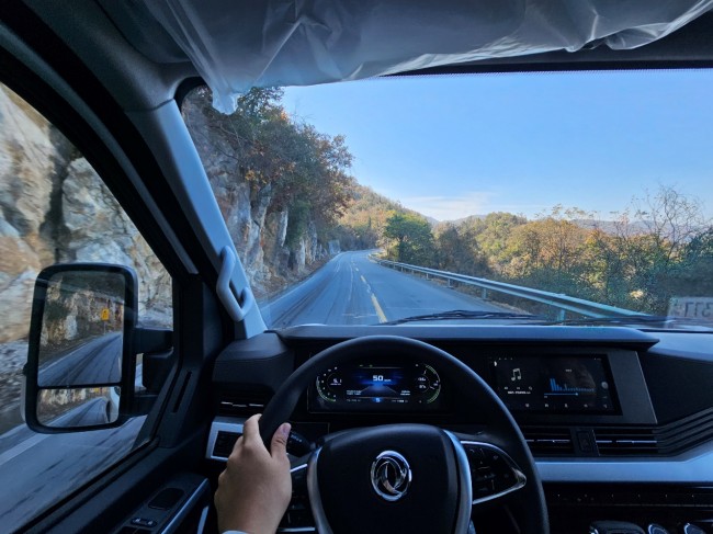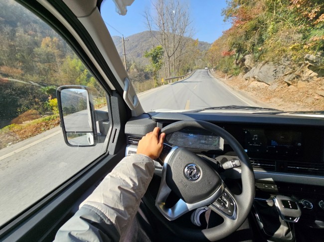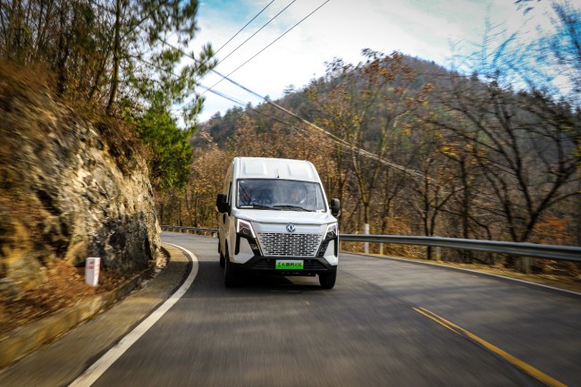 此次路線是從東風(fēng)新能源商用車陣地工廠出發(fā),到香水河景區(qū),全程下道108km,往返就是216km,再加上去封閉試車道路的里程大致在250km左右。其實(shí)對于電動車而言,駕駛感還是要比油車輕盈的,因?yàn)殡婒?qū)橋的緣故,這輛車沒有傳動軸,所以在動力響應(yīng)上更加及時(shí),再者商用車的電動機(jī)相對來說輸出比較線性,起步和加速都很快。