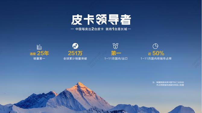 作為皮卡領(lǐng)導(dǎo)者,長城皮卡連續(xù)25年銷量第一,全球累計銷量突破251萬臺。今年1-11月全球累計銷售突破18.6萬臺,斬獲國內(nèi)、出口銷量雙第一,國內(nèi)終端市占率近50%,中國每賣出兩臺皮卡,就有一臺是長城。長城炮品牌四周年,更成為首個突破50萬臺的中國高端皮卡品牌,創(chuàng)造新的“長城炮速度”,持續(xù)引領(lǐng)中國皮卡向上。