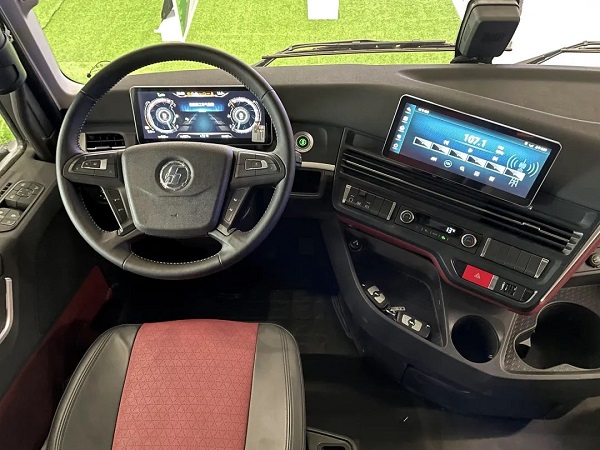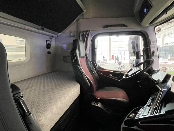 拉開延安重卡S700的車門,你會發(fā)現(xiàn)這款車配有無鑰匙進入功能。純平地板的駕駛室沒有任何凸起,這使得駕駛室內(nèi)高達到了2.13米,空間非常寬裕,全車具有超過1000L的儲物空間。內(nèi)飾造型風格非常年輕化。12.3寸液晶儀表和大屏也是目前主流高端重卡的配置。諸如一鍵啟動、自動大燈、自動雨刮、自動空調都是標配。實拍車型還都配備了電子手剎。