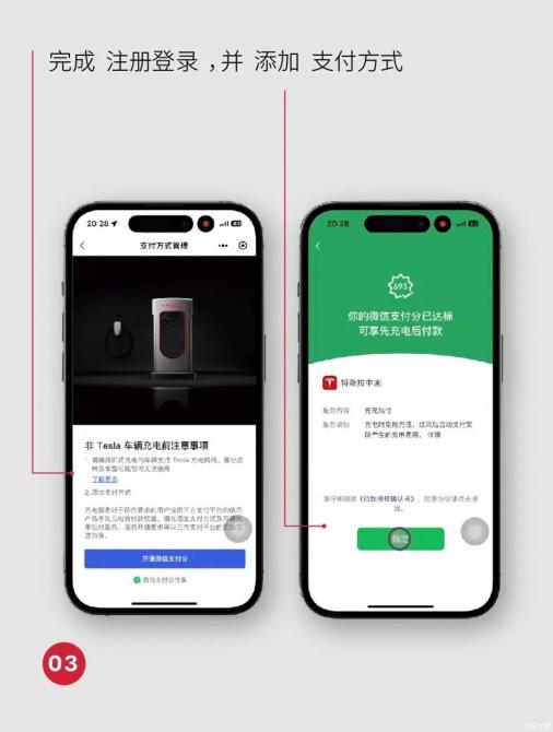 微信搜索或掃描充電槍頭旁邊的二維碼,在充電站詳情頁(yè)底部點(diǎn)擊為非特斯拉車(chē)輛充電,完成注冊(cè)登陸,并添加支付。成功綁定支付方式后,回到所在超級(jí)充電站詳情頁(yè),點(diǎn)擊開(kāi)始充電。如充電車(chē)位已安裝地鎖,選擇充電車(chē)位并打開(kāi)地鎖后,選擇充電樁,駛?cè)雽?duì)應(yīng)車(chē)位后,插入充電線纜即可充電。充電過(guò)程中,通過(guò)小程序可以實(shí)時(shí)查看充電狀態(tài),點(diǎn)擊"停止充電"或充電完成。此外還可以通過(guò)特斯拉App進(jìn)行相關(guān)操作。