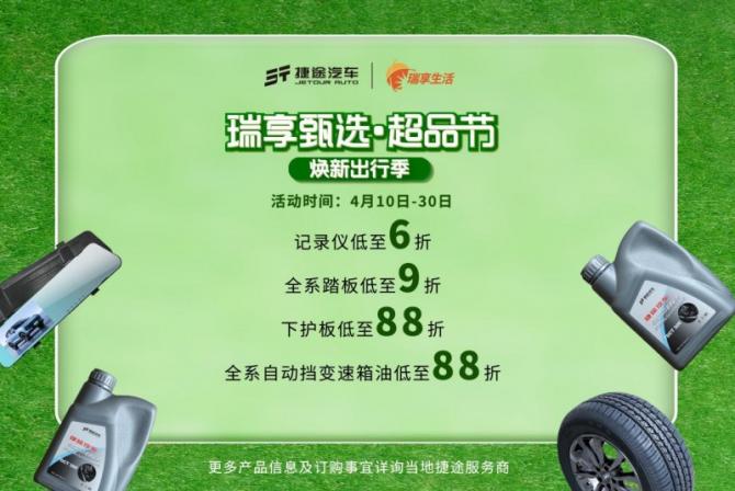 本次活動,旨在讓廣大用戶享受到奇瑞高性價比品質(zhì)產(chǎn)品的同時,為用戶打造舒適、安心和愉悅的“瑞享生活”。即日起-4月30日奇瑞首屆“超品節(jié)”活動期間,捷途甄選原廠認(rèn)證行車記錄儀低至6折、全系踏板、自動擋變速箱油及下護(hù)板88折等多項優(yōu)惠。同時,在活動期間進(jìn)站保養(yǎng)更有驚喜好禮。