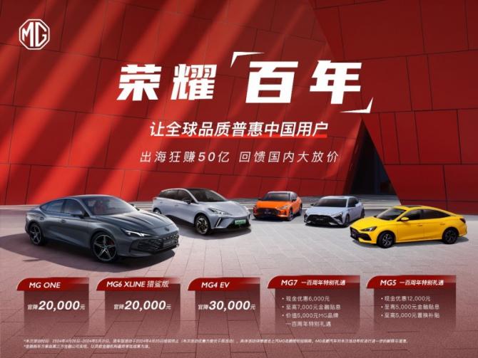 在此次“榮耀百年”回饋活動中,MG品牌推出了一系列令人激動的優(yōu)惠政策,包括全球首款電動鋼炮MG4 EV直降3萬元、品質(zhì)潮玩SUV MG ONE和潮能玩家之選MG6 XLINE獵鯊版直降2萬元、至美B級轎跑MG7一百周年特別禮遇1.8萬元以及MG5一百周年特別禮遇2.2萬元。這些優(yōu)惠措施不僅彰顯了MG品牌對消費(fèi)者的深厚誠意,更是對其百年品質(zhì)的自信宣言。