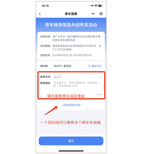 第三步:選擇推薦車(chē)場(chǎng)、填寫(xiě)推薦理由,可以為你的目的地車(chē)場(chǎng)或者周邊車(chē)場(chǎng)填寫(xiě)停車(chē)攻略,內(nèi)容信息可包含:
