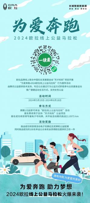 伴著人們高漲的運動熱情,歐拉品牌聯(lián)合中國婦女基金會“天才媽媽”項目,同步開啟“為愛奔跑?2024歐拉線上公益馬拉松”活動,號召全民積極參與健身運動、拓寬健康生活半徑,更為女性公益注入源源不斷的支持和活力。