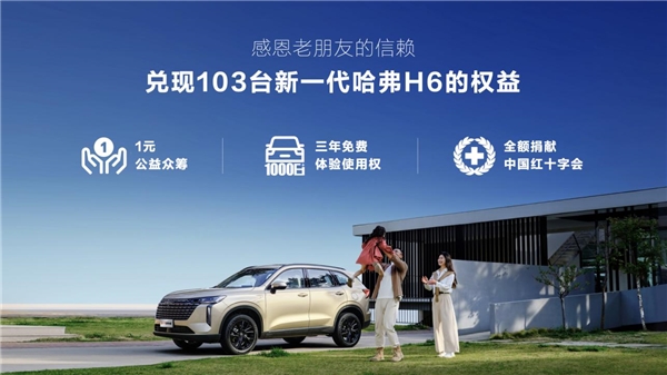 在新一代哈弗H6預(yù)售直播中,哈弗兌現(xiàn)了魏建軍承諾的送103輛H6權(quán)益,用戶僅需在線上完成1元捐贈即可報名參與,并且有機會獲得新一代哈弗H6 Hi4版三年免費使用權(quán);而捐贈資金,哈弗承諾全額捐給中國紅十字會,為公益事業(yè)添磚加瓦。
