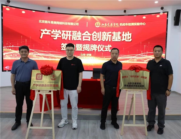在簽約儀式現(xiàn)場,查博士副總裁孫強(qiáng)、山東交通學(xué)院資產(chǎn)經(jīng)營公司黨委書記、董事長李西田共同為新能源產(chǎn)學(xué)研融合創(chuàng)新基地揭牌。查博士新能源事業(yè)部校企合作經(jīng)理趙晨曦、山東交通學(xué)院檢測實驗中心主任山云霄共同為“時代匠新”新能源人才培訓(xùn)基地揭牌。