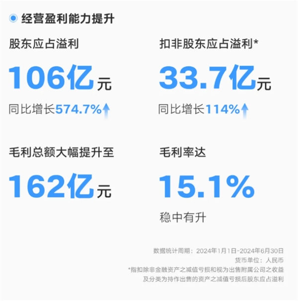 ? 集團(tuán)經(jīng)營盈利能力顯著提升:上半年股東應(yīng)占溢利106億元,同比大增574.7%;實現(xiàn)扣非股東應(yīng)占溢利33.7億元,同比增長114%;毛利總額大幅提升至162億元,毛利率達(dá)15.1%。
