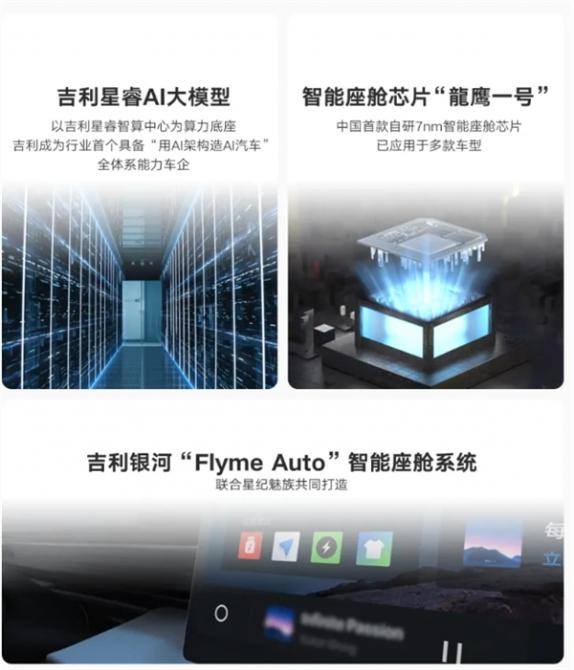 在智能化方面,今年5月30日,吉利汽車發(fā)布了聯(lián)合星紀(jì)魅族共同打造銀河的“Flyme Auto”智能座艙系統(tǒng)。人工智能上,以吉利星睿智算中心為算力底座的自研基礎(chǔ)大模型——吉利星睿AI大模型正式發(fā)布,吉利成為行業(yè)首個具備“用AI架構(gòu)造AI汽車”的全體系能力的車企。中國首款自研7nm智能座艙芯片"龍鷹一號",已在吉利銀河E5率先搭載。[2]