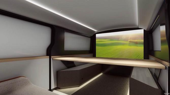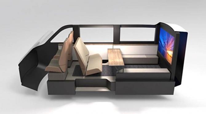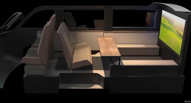 車輛內(nèi)部,正常行駛情況下,會(huì)與傳統(tǒng)的車型一樣,正向的座椅布局。但它的后排也可以變?yōu)橐苿?dòng)的客廳,之所以車尾沒(méi)有車窗,是因?yàn)檐囄脖话仓昧艘粋€(gè)巨大的電視。后排座椅可以向后旋轉(zhuǎn),側(cè)面的車窗可以像百葉窗一樣關(guān)閉,形成私密的影音會(huì)客廳。后排的桌子也可以隨時(shí)移動(dòng)調(diào)整位置。