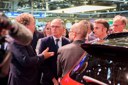 唐唯實(shí)陪同法國(guó)總統(tǒng)馬克龍(右二)參觀Stellantis集團(tuán)展臺(tái)