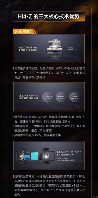 具體來看,這套架構(gòu)配備了容量為59.05千瓦時的電池,WLTC工況純電續(xù)航可達200km以上,快充功率可達163kW,充電15分鐘,純電續(xù)航增加120km。這套動力系統(tǒng)最大綜合功率715kW,0-100km/h加速為4秒級,饋電狀態(tài)依然能實現(xiàn)5秒級的0-100km/h加速。此外,Hi4-Z的發(fā)動機通過采用米勒循環(huán)、低壓EGR等節(jié)能技術(shù),實現(xiàn)2.0T發(fā)動機熱效率40%,3.0T發(fā)動機熱效率38.5%。