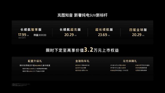 憑借領(lǐng)先同級的產(chǎn)品實力,嵐圖知音自亮相以來就得到了業(yè)界廣泛關(guān)注和認可。在正式上市后的24小時,嵐圖知音訂單便達到8126臺,其中,長續(xù)航超充版廣受好評,訂單超50%。當前,嵐圖知音全國各地的試駕、交付均在火熱進行中,預(yù)訂用戶也在持續(xù)增長。限量3000臺的17.99萬元長續(xù)航智享版嵐圖知音現(xiàn)已增產(chǎn),10月31日(含)前下定并鎖單的用戶可確保新車交付。同時,11月30日前下定可享配置升級禮、金融購車禮等至高3.2萬元限時上市權(quán)益,已經(jīng)進入倒計時階段?,F(xiàn)在去嵐圖線下門店即可到店試駕體驗,提前鎖定心儀的愛車。