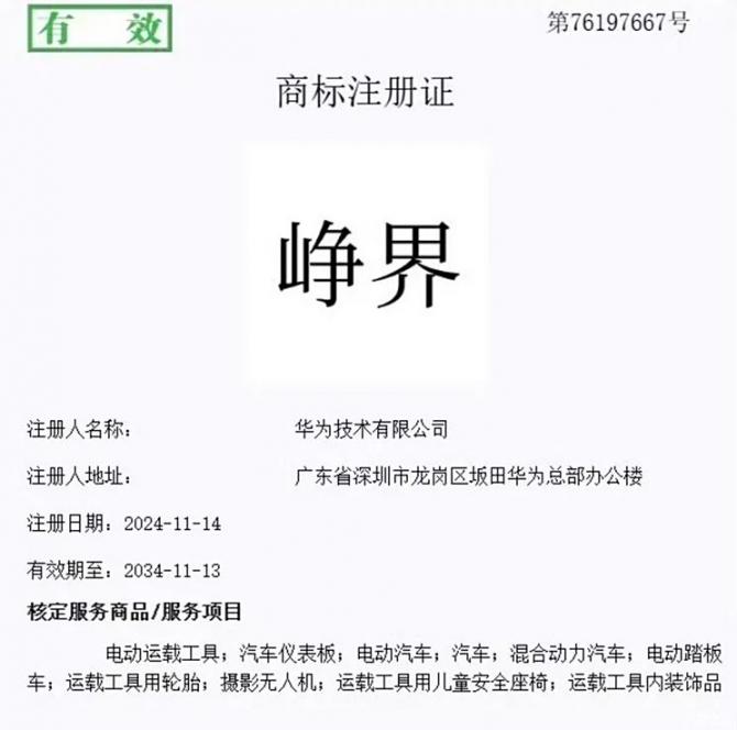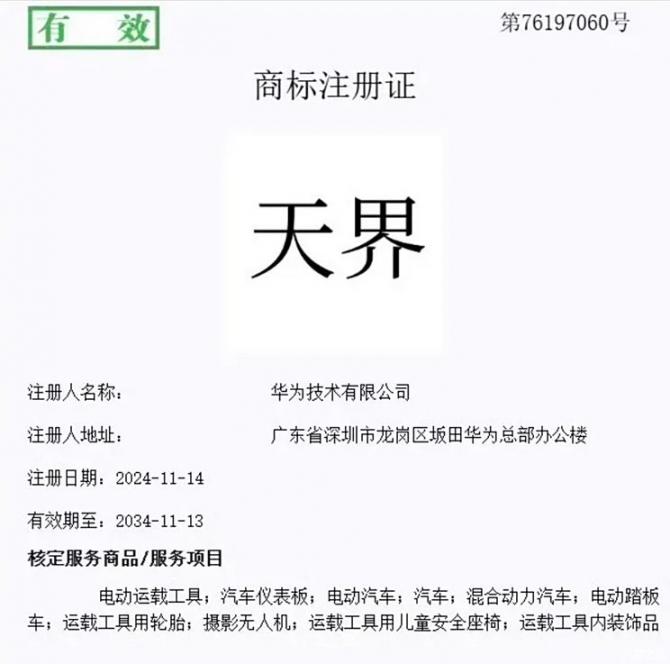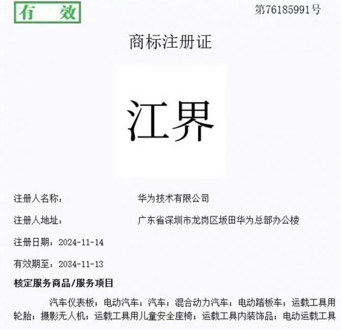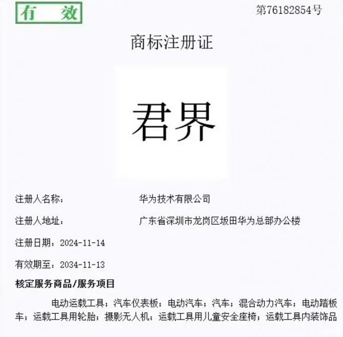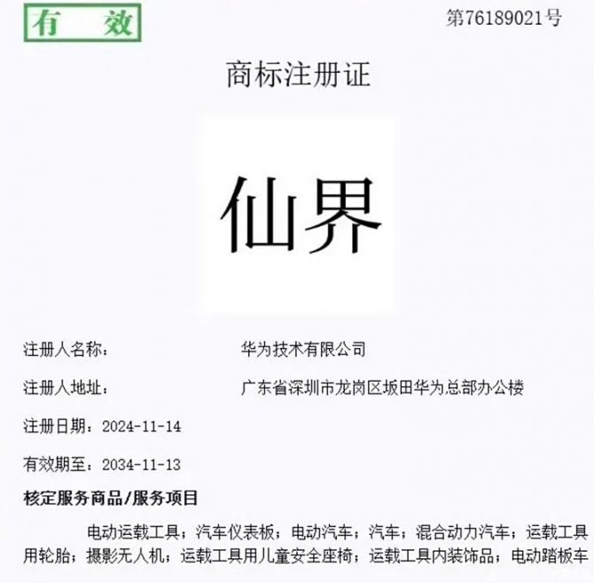 亞訊車網(wǎng)m.sbu3.com】國家知識(shí)產(chǎn)權(quán)局公告顯示,華為技術(shù)有限公司成功注冊(cè)了“仙界”、“天界”、“君界”、“崢界”、“江界”等一系列商品,幾個(gè)界的名稱都高端大氣,聽上去比尊界還要高級(jí)。