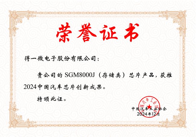 大會策劃了2024中國汽車芯片創(chuàng)新成果發(fā)布儀式。該評選由中國汽車工業(yè)協(xié)會組織開展,經(jīng)業(yè)內(nèi)權(quán)威專家及車企應(yīng)用端聯(lián)合推薦,經(jīng)層層篩選與嚴(yán)格評審,得一微電子的SGM8000J系列高可靠車規(guī)級eMMC存儲芯片,憑借其卓越的上車表現(xiàn)、供貨穩(wěn)定性、創(chuàng)新能力及應(yīng)用前景等多方面的領(lǐng)先優(yōu)勢,成功獲獎。