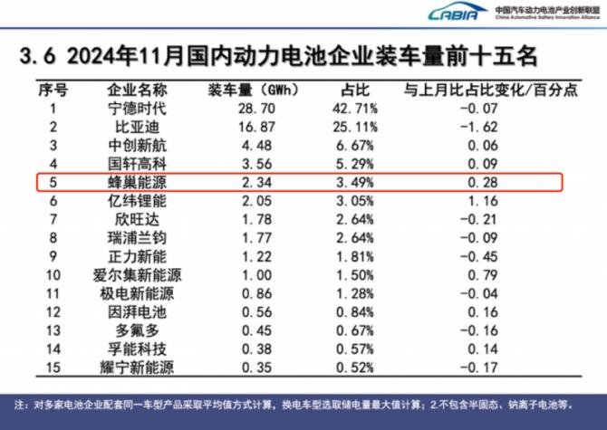 中國汽車動力電池產(chǎn)業(yè)創(chuàng)新聯(lián)盟公布的最新數(shù)據(jù)顯示,11月份,蜂巢能源在國內(nèi)市場裝機量2.34GWh,創(chuàng)歷史新高,環(huán)比增長23.16%,同比增長68.35%,蟬聯(lián)國內(nèi)裝機量排行榜第5名。如果只看三元市場,蜂巢能源10月裝車量甚至做到了國內(nèi)前三。