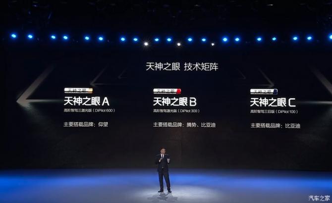 根據(jù)官方現(xiàn)場介紹,天神之眼A為高階智駕三激光版(DiPilot 600)、天神之眼B為高階智駕激光版(DiPilot 300)、天神之眼C為高階智駕三目版(DiPilot 100),不同版本具體攝像頭如圖。