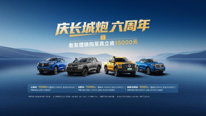 值此六周年之際,長城炮正式推出“慶長城炮六周年,老友增換購至高立省15000元”活動,感恩回饋全球用戶的長期信賴與支持。即日起至9月30日,用戶增換購長城炮車型可享8000-15000元老友煥新禮,同時,購買山海炮還限時尊享6次免費保養(yǎng)。