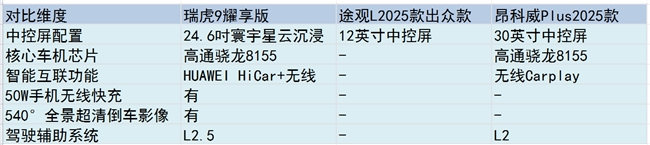 更值得一提的是,瑞虎9耀享版獨家配備50W手機無線快充功能,這一配置在15萬左右燃油車市場中極為罕見,能夠為用戶解決手機續(xù)航焦慮,提升出行便利性。此外,瑞虎9耀享版還搭載了540°全景超清倒車影像與L2.5級駕駛輔助系統(tǒng),其中L2.5級駕駛輔助系統(tǒng)在功能豐富度與智能化水平上均優(yōu)于昂科威Plus 2025款28T兩驅白金版的L2級系統(tǒng),而途觀L2025款出眾款330TSI 自動兩驅R-Line龍耀版則未配備全景倒車影像與高級駕駛輔助系統(tǒng)。
