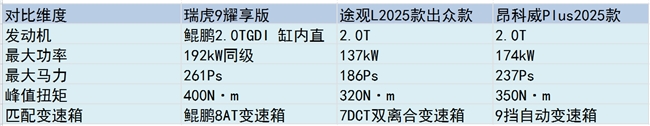 動力性能是決定一款燃油車駕駛體驗的核心因素之一,瑞虎9耀享版在動力系統(tǒng)的調校與配置上展現(xiàn)出深厚的技術積累。發(fā)動機方面,瑞虎9耀享版搭載鯤鵬2.0TGDI缸內直噴渦輪增壓發(fā)動機,最大功率達到192kW,馬力達到261Ps,峰值扭矩為400N?m,這一動力參數(shù)不僅遠超途觀L 2025款出眾款330TSI 自動兩驅R-Line龍耀版的2.0T發(fā)動機(最大功率137kW,馬力186Ps,峰值扭矩320N?m),也優(yōu)于昂科威Plus2025款28T兩驅白金版的2.0T發(fā)動機(最大功率174kW,最大馬力237Ps,峰值扭矩350N?m)。