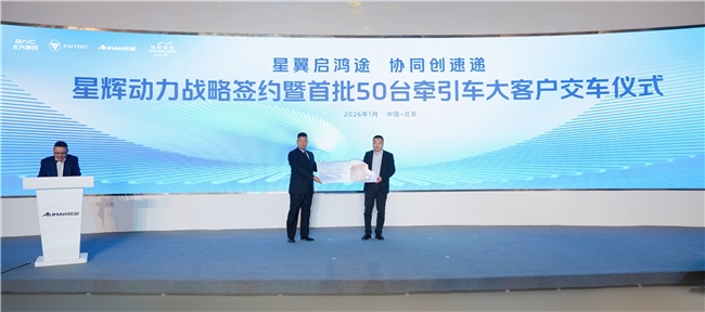2026年1月20日,以“星翼啟鴻途、協(xié)同創(chuàng)速遞”為主題的星輝動力戰(zhàn)略簽約暨首批 50臺牽引車大客戶交車儀式在北京超級卡車體驗中心隆重舉行?;顒蝇F(xiàn)場,北汽福田歐曼與北京鴻翔物流進行戰(zhàn)略合作簽約,并正式交付首批50臺歐曼星翼牽引車。這既是歐曼重卡以場景定制方案助推快運物流行業(yè)轉(zhuǎn)型升級的高效實踐,也為現(xiàn)代流通體系高質(zhì)量發(fā)展注入了強勁動力。來自北汽集團、北汽福田、歐曼事業(yè)部等相關(guān)領(lǐng)導(dǎo),以及北京鴻翔相關(guān)負(fù)責(zé)人、核心經(jīng)銷商、合作伙伴、媒體代表等共同見證這一標(biāo)志性時刻。