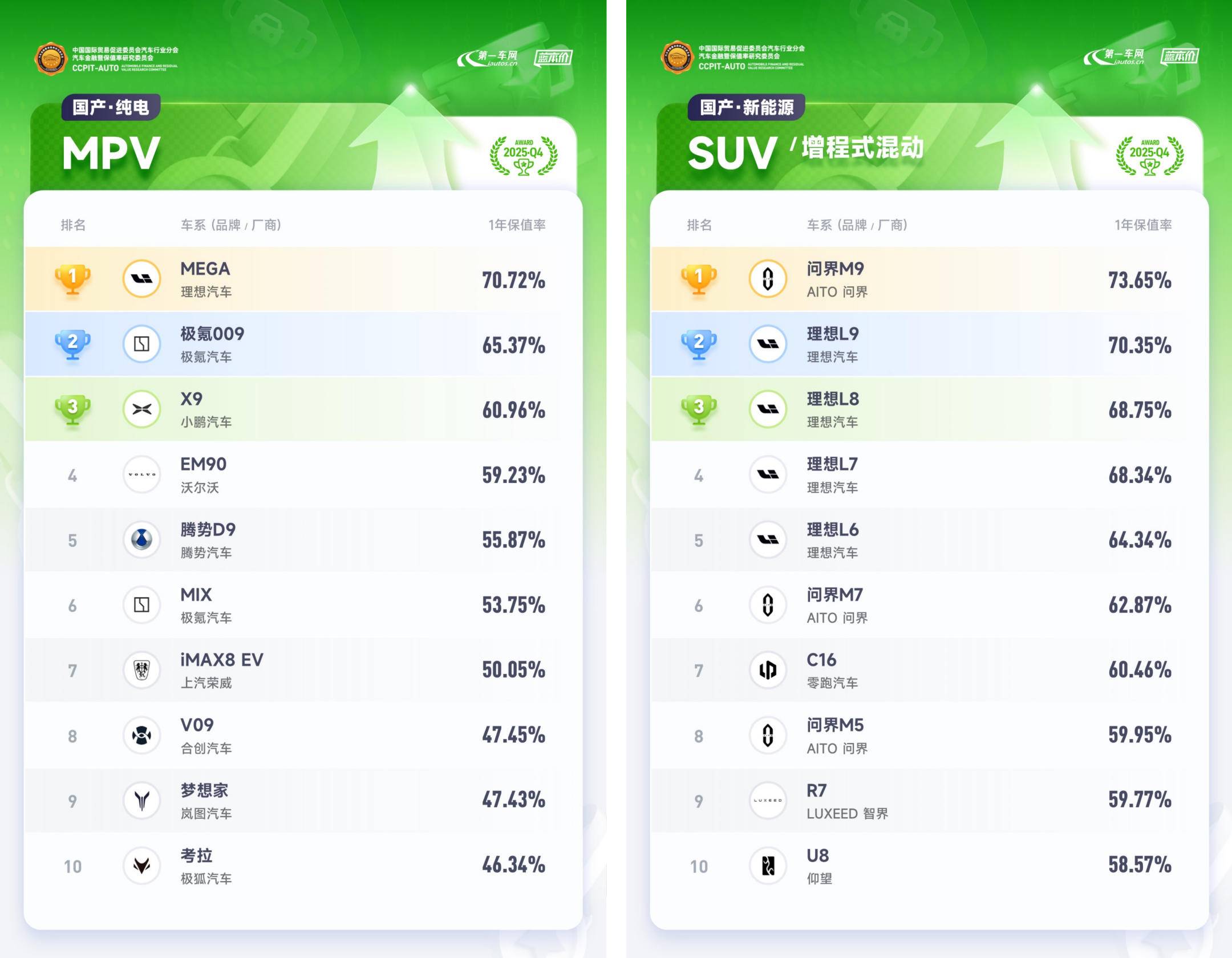 新能源車方面,在政策引導(dǎo)下加速技術(shù)升級,固態(tài)電池、800V超充等技術(shù)進入量產(chǎn)階段。小米SU7憑借強勁的市場表現(xiàn),以70.22%的1年保值率登頂國產(chǎn)純電中大型轎車排行榜;特斯拉Model 3、Model Y兩款車型分別憑借68.44%、67.06%的1年保值率排在國產(chǎn)純電中型轎車、國產(chǎn)純電中型SUV排行榜首位;理想MEGA以較大優(yōu)勢摘得國產(chǎn)純電MPV排行榜冠軍,其1年保值率為70.72%;GL8陸尊PHEV則以68.01%的1年保值率在國產(chǎn)插電式混動MPV排行榜中登頂冠軍;秦PLUS DM、漢DM和UNI-V智電iDD位居國產(chǎn)插電式混動轎車排行榜TOP3,1年保值率分別為58.68%、58.68%、57.94%;坦克系列包攬國產(chǎn)插式電式混動SUV排行榜前三名,坦克700Hi4-T、坦克500Hi4-T、坦克400Hi4-T的1年保值率分別為75.22%、69.29%、68.62%。